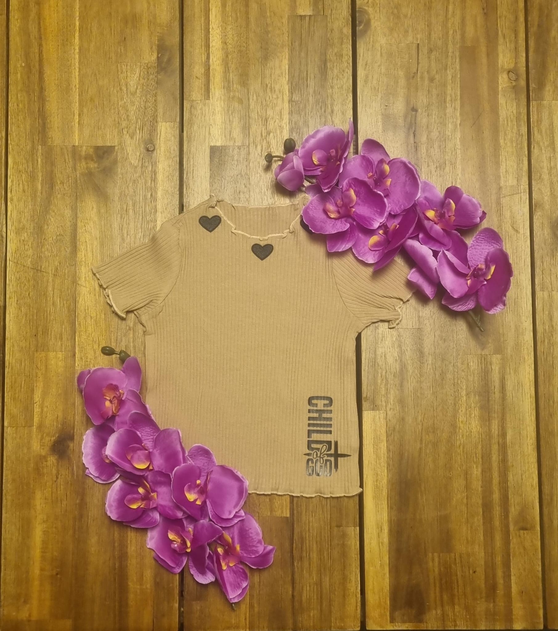 Dit zachte beige T-shirt is een subtiel maar krachtig statement: Child of God. Het minimalistische design met stijlvolle hartjes bij de halslijn en de ingetogen opdruk maakt dit shirt uniek en tijdloos. Perfect voor kinderen die vanaf jonge leeftijd hun identiteit in Christus mogen uitdragen.