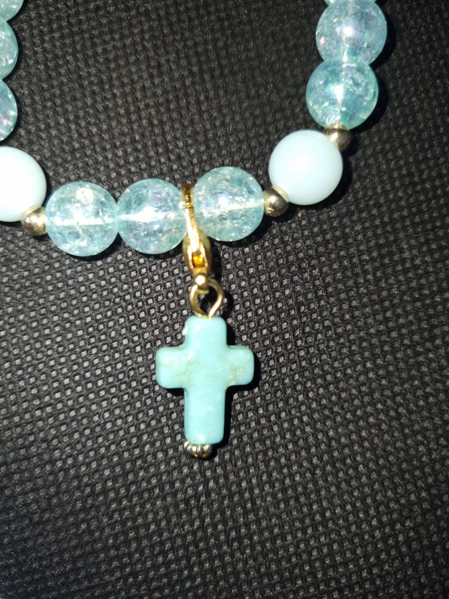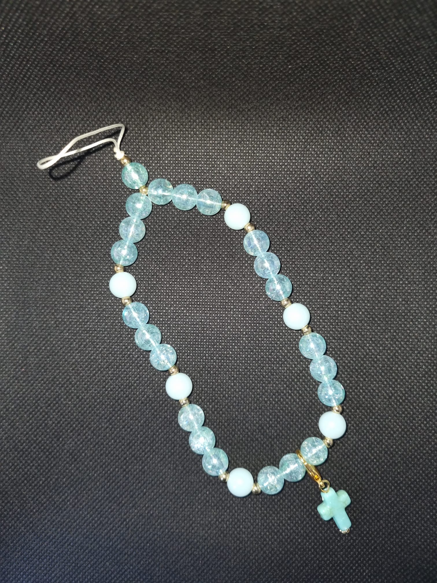 Stijlvol handgemaakt telefoonkoord met blauwe kralen en turquoise kruisbedel. Geloofsversterkend accessoire voor dagelijks gebruik.