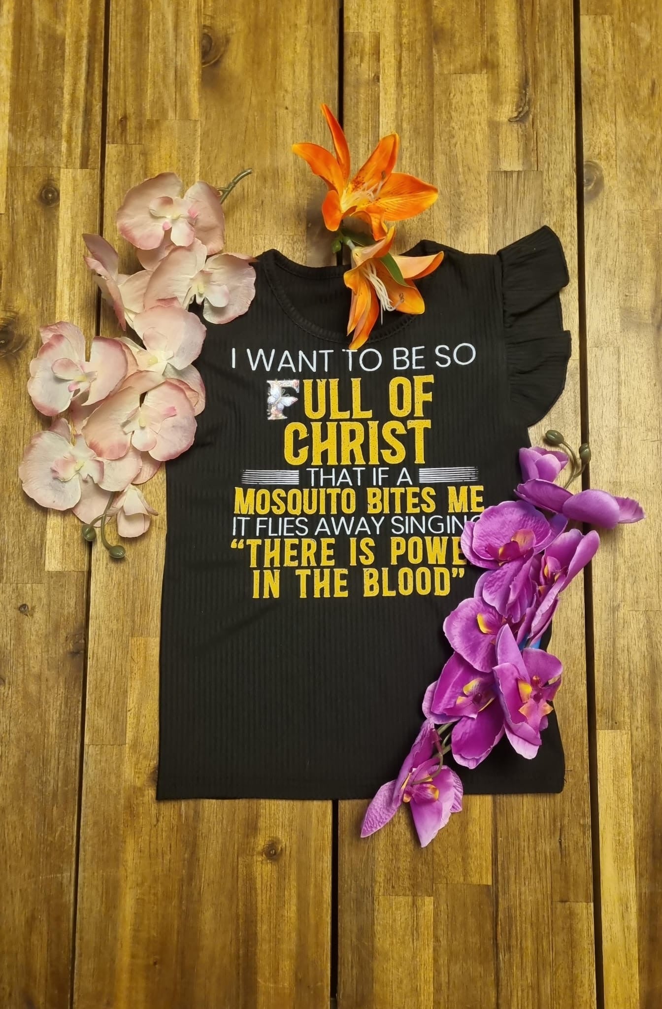 Zwart met leuke pofmouwtjes 🦟 maat 116 POWER IN THE BLOOD OF CHRIST